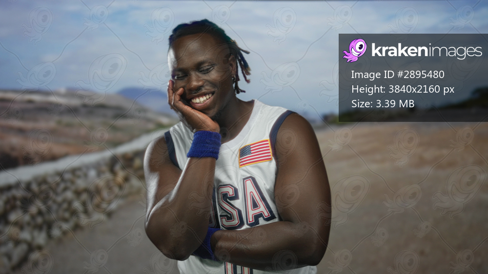 Young african american man smiling with hand on cheek and bare arms on a street wearing usa basketball jersey with flag patch; joy confidence.