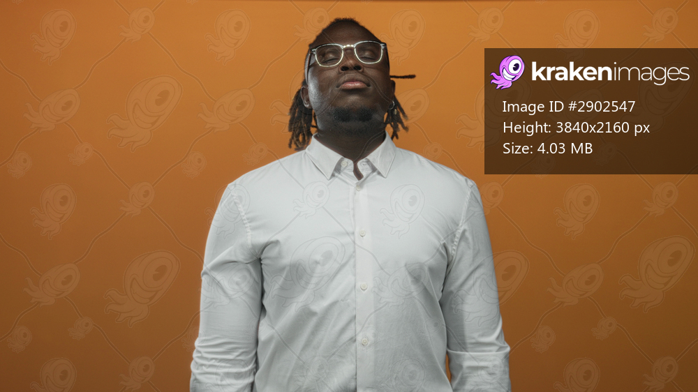 Young african american man standing with closed eyes and glasses wearing white shirt in orange studio; calm introspection.