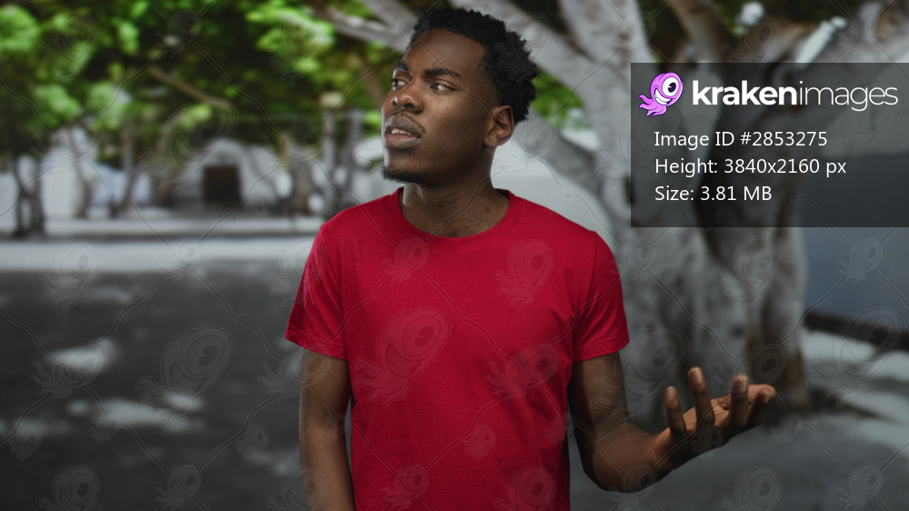 Young african american man standing with hand open palm gesture on sunlit tree lined street; curiosity.