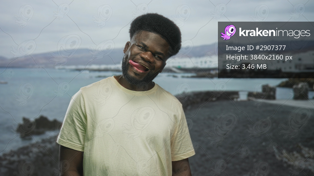 Young african american man sticking out tongue beside a seaside white building on a rocky shore by the ocean; playful confidence.
