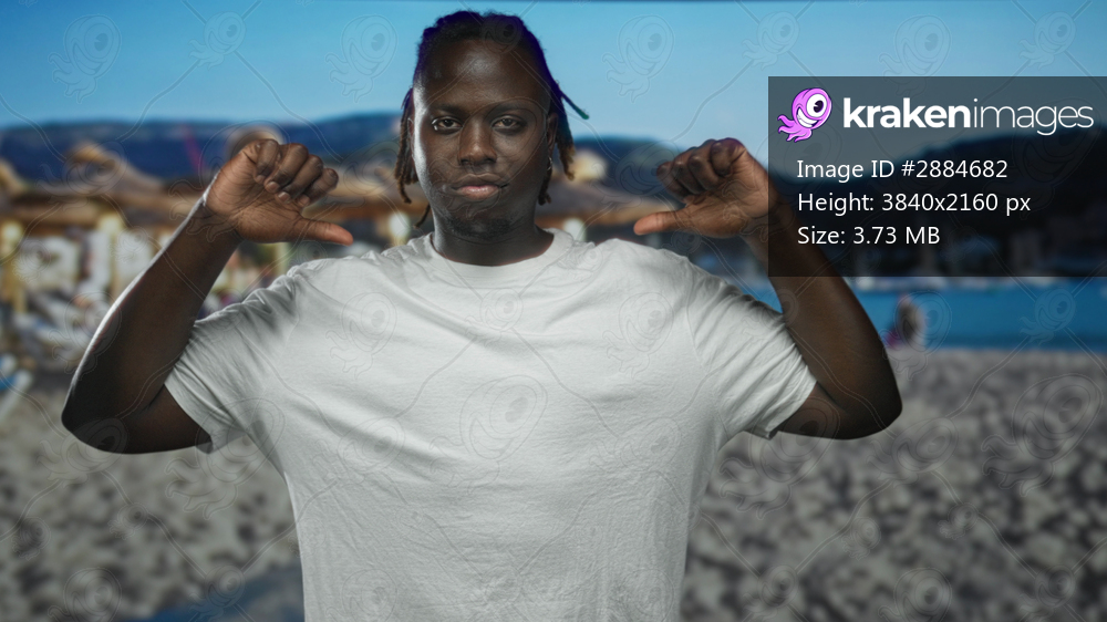Young african american man with thumbs pointing to chest wearing white tshirt in studio portrait with beach backdrop; self confidence.
