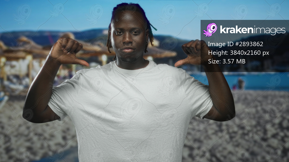 Young african american man with thumbs pointing to chest wearing white tshirt in studio portrait with beach backdrop; self confidence.
