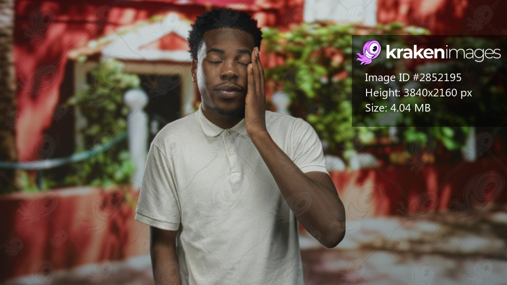Young african american man touches cheek with hand on busy city street in daylight for toothache; fatigue exhaustion weariness tiredness.