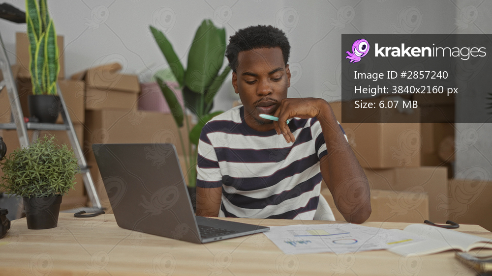 Young african american man typing on laptop in a sparsely furnished building with stacked cardboard moving boxes and potted plants; focus productivity concentration determination. - Kraken Images