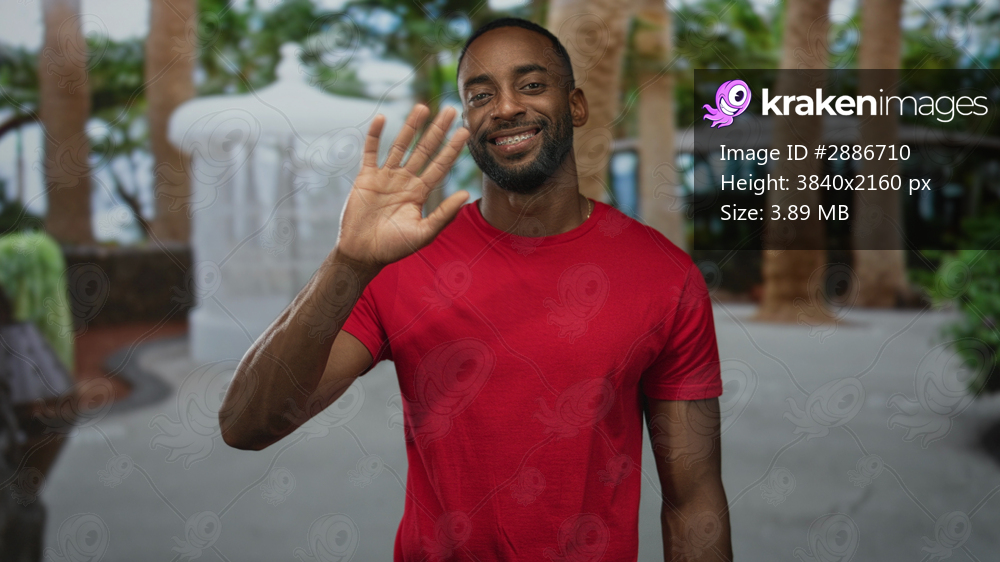 Young african american man waves hand and smiles in park near fountain and palm trees wearing red t shirt and visible braces; friendly joy.