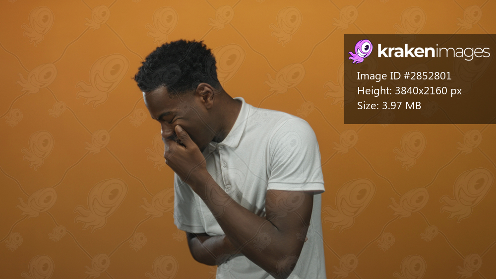 Young african american man wearing a white polo shirt covers mouth with hand in an orange studio; amusement.