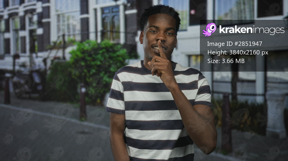 Young african american man wearing black and white striped shirt stands holding finger to lips for silence on busy street; quiet secrecy.
