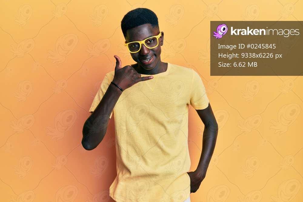 Young african american man wearing casual clothes and glasses smiling doing phone gesture with hand and fingers like talking on the telephone. communicating concepts. - Kraken Images
