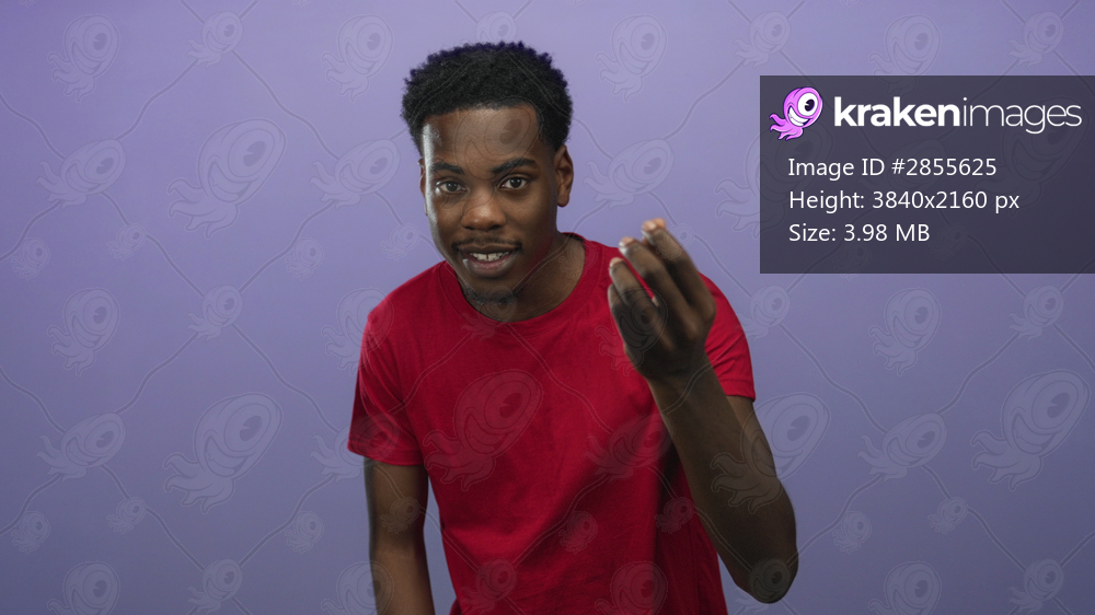 Young african american man wearing casual red t shirt beckons with fingers in studio setting; invitation.