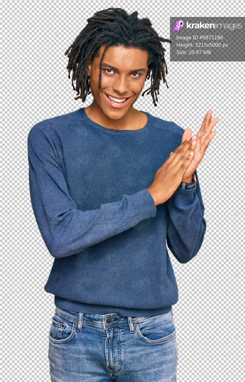 Young african american man wearing casual winter sweater clapping and applauding happy and joyful, smiling proud hands together