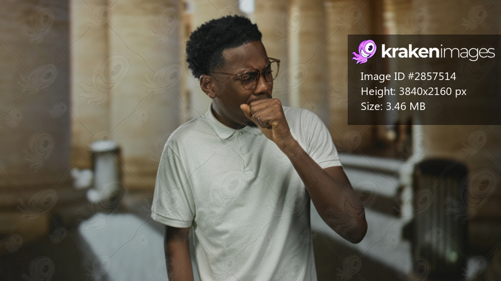 Young african american man wearing eyeglasses coughs into fist against stone building columns; discomfort illness awareness.