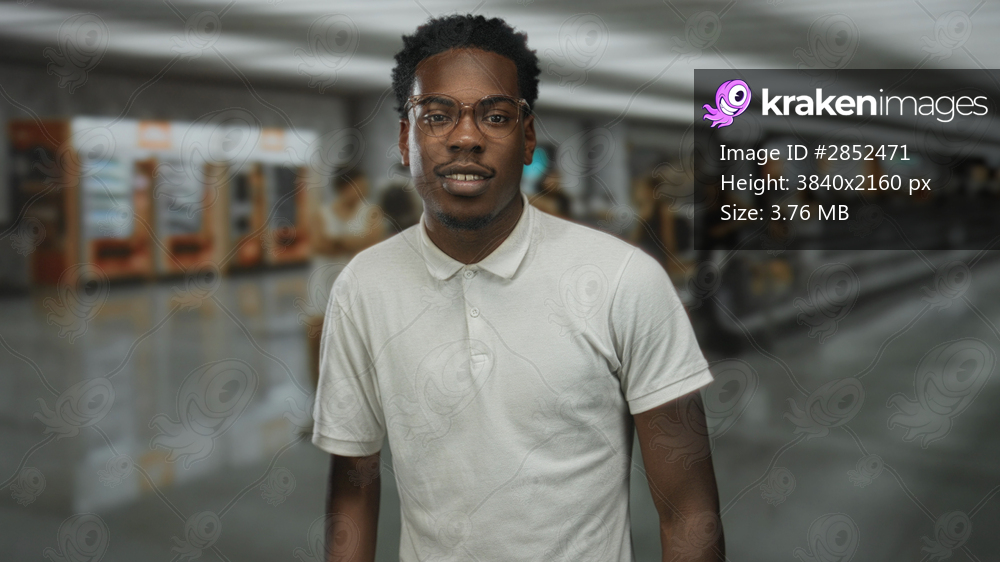 Young african american man wearing glasses and a white polo shirt walking through airport; confidence.