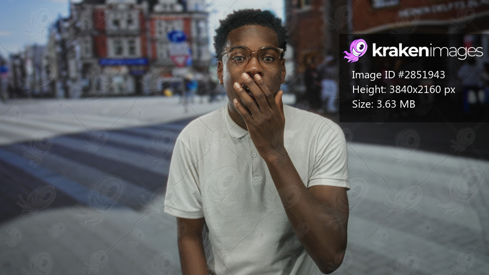Young african american man wearing glasses covering mouth with hand while looking ahead on busy city street; surprise.