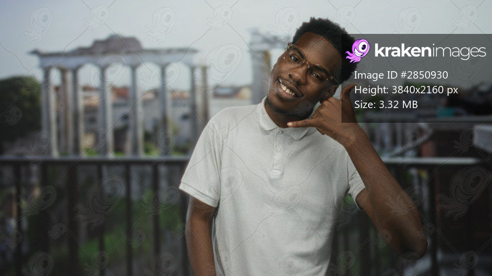 Young african american man wearing glasses hand as phone for call at building in sunlight; cheerful connection.