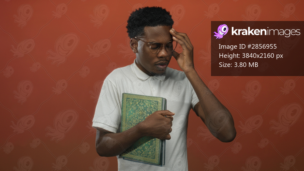 Young african american man wearing glasses holds green book and touches forehead in studio; stress.