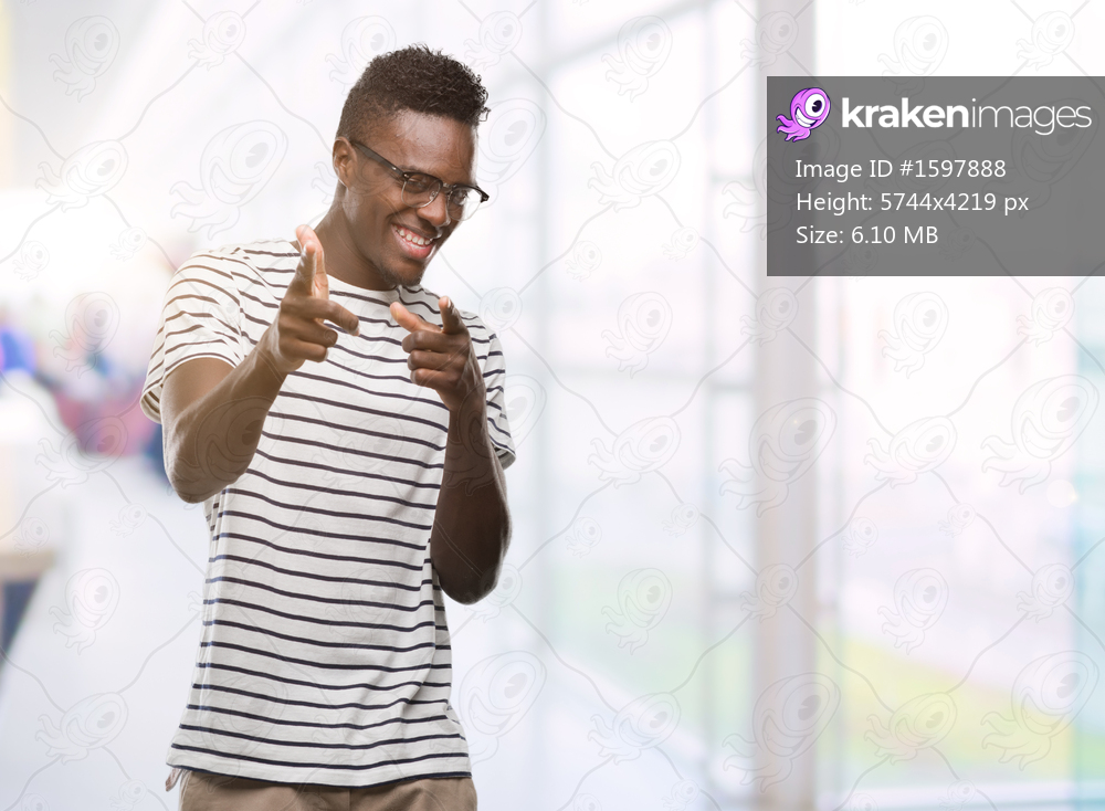 Young african american man wearing glasses and navy t-shirt pointing fingers to camera with happy and funny face. Good energy and vibes.