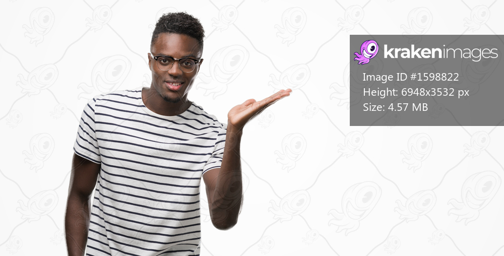Young african american man wearing glasses and navy t-shirt smiling cheerful presenting and pointing with palm of hand looking at the camera.