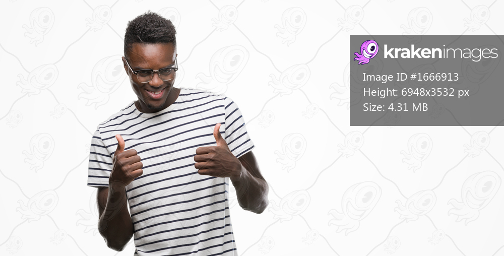 Young african american man wearing glasses and navy t-shirt success sign doing positive gesture with hand, thumbs up smiling and happy. Looking at the camera with cheerful expression, winner gesture. - Kraken Images