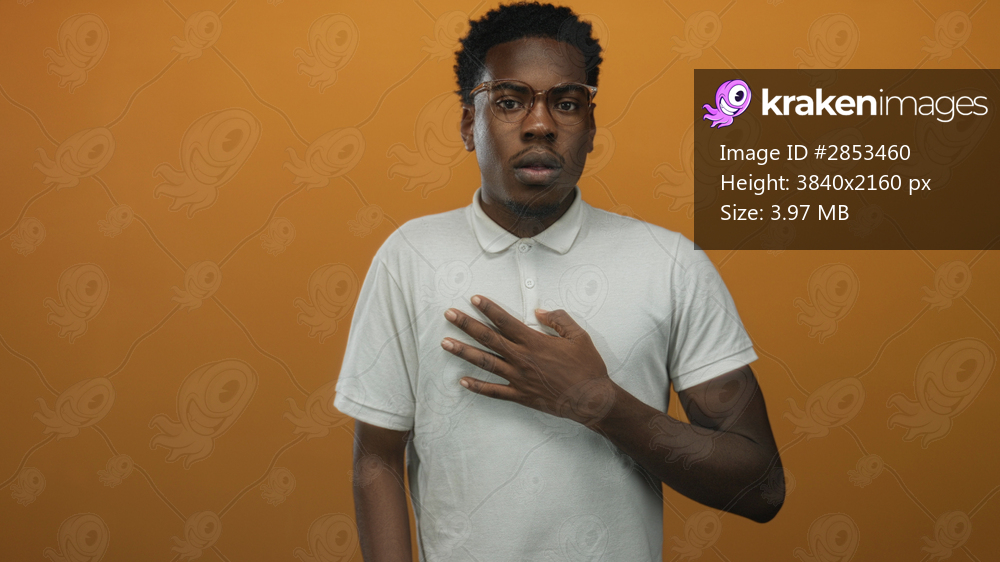 Young african american man wearing glasses and polo shirt in studio before orange wall with hand on chest; concern.
