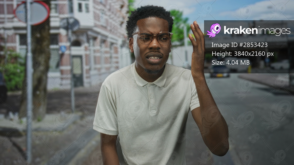 Young african american man wearing glasses raises hand to head on busy city street amid cars; confusion.