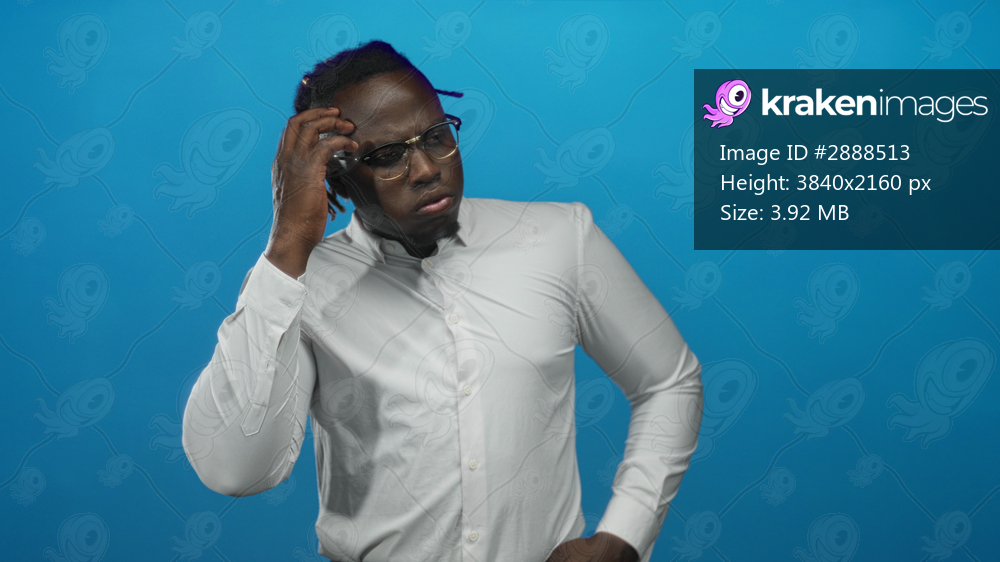 Young african american man wearing glasses touches his head and looks upward against a bright blue studio wall; confusion decision.