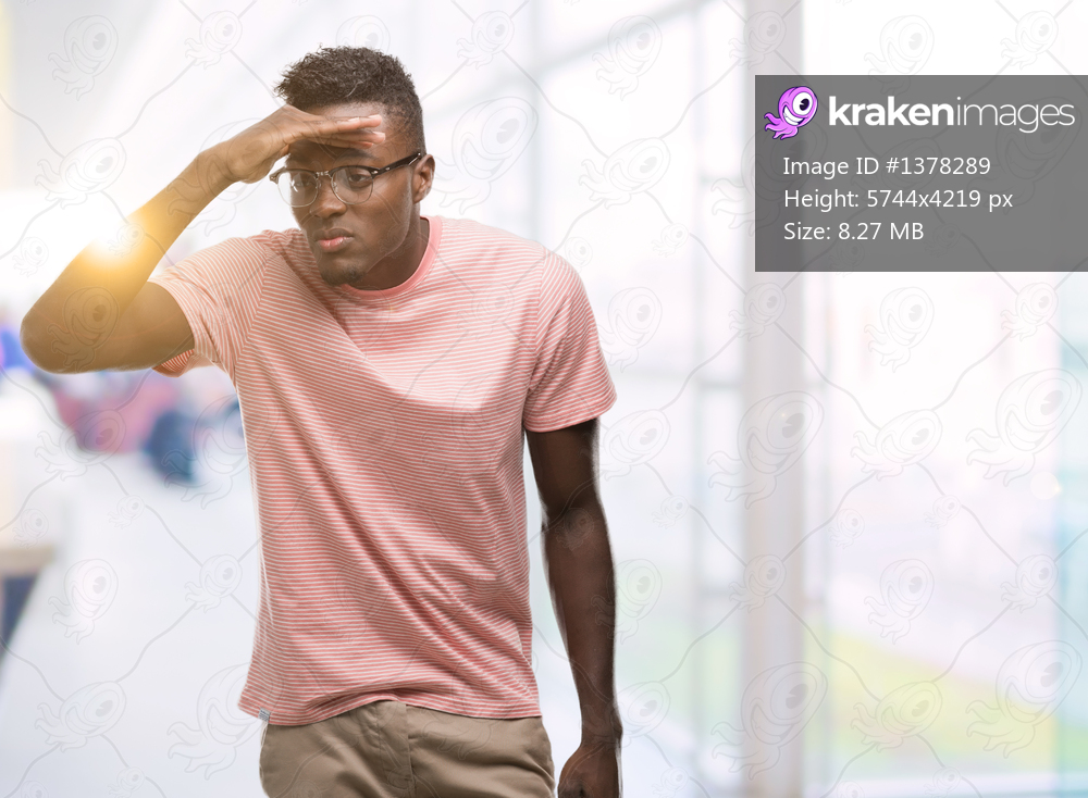 Young african american man wearing pink t-shirt very happy and smiling looking far away with hand over head. Searching concept.