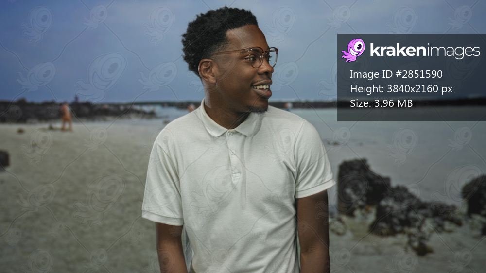 Young african american man wearing polo shirt and smiling with glasses on sandy beach near rock formation; serenity and new beginnings.