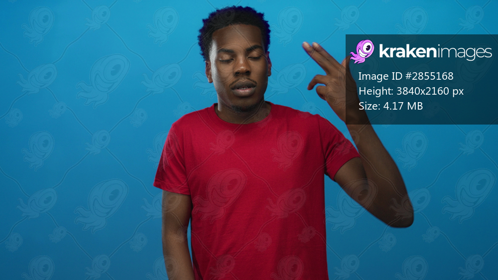 Young african american man wearing red shirt pointing finger toward camera in blue studio; confidence.