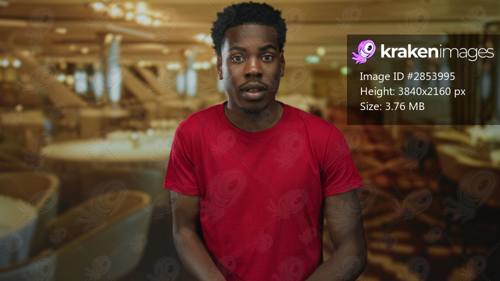 Young african american man wearing red t shirt holds wrist at restaurant bar counter; uncertainty reflection.