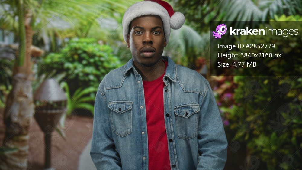 Young african american man wearing santa hat and denim jacket covers mouth in green forest; holiday surprise.