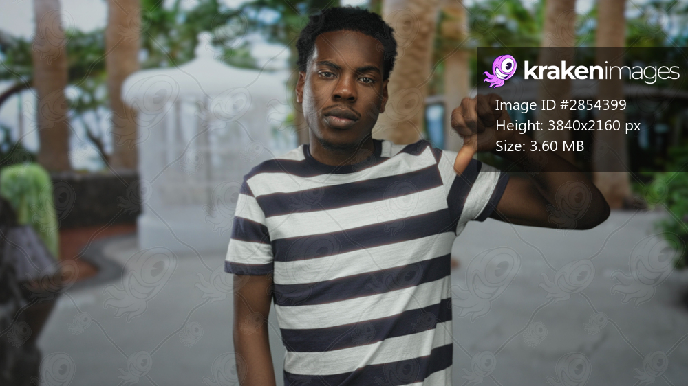Young african american man wearing striped shirt making thumbs down gesture on a street near trees; disapproval.