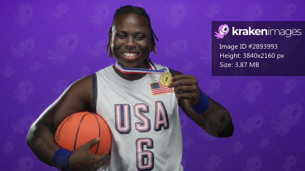Young african american man wearing usa jersey holding basketball and gold medal in purple studio; victory pride.