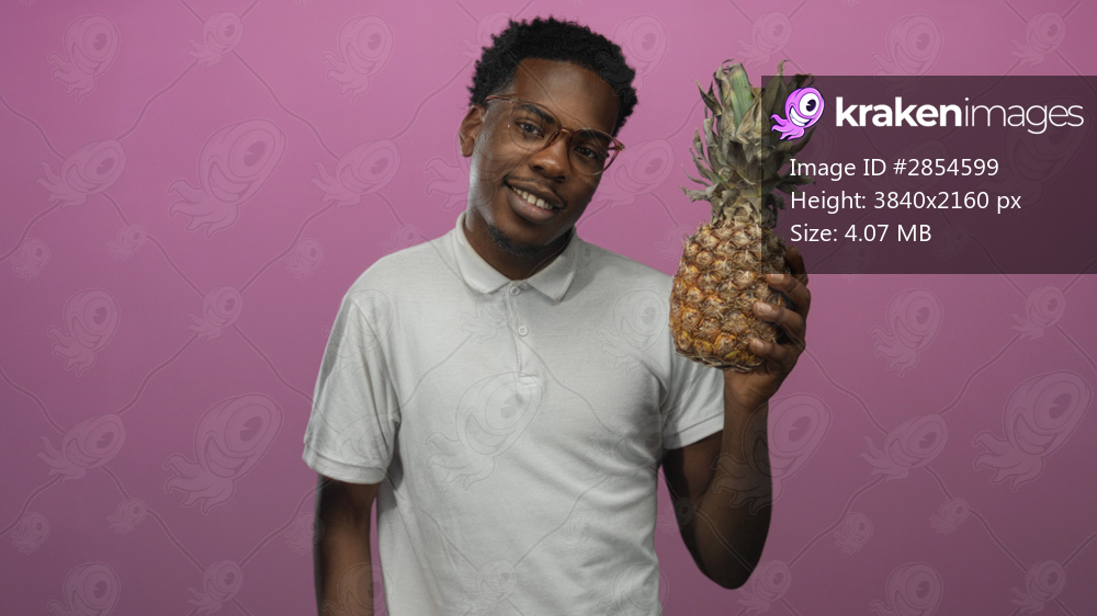 Young african american man wearing white polo holds ripe pineapple against pink studio backdrop; tropical freshness joy.