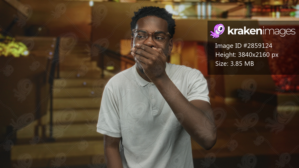 Young african american man wearing white polo shirt and eyeglasses covers mouth with hand by grand staircase in hotel building; surprise.
