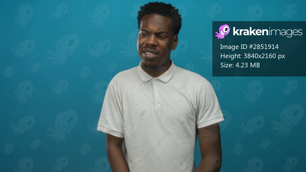 Young african american man wearing white polo squints eyes in blue studio with subtle head tilt; doubt uncertainty.
