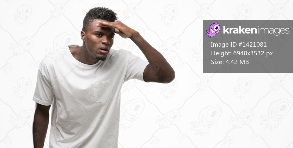 Young african american man wearing white t-shirt very happy and smiling looking far away with hand over head. Searching concept.