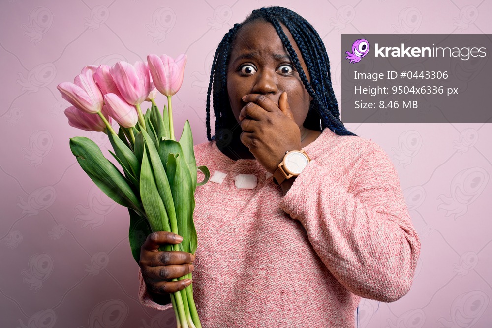 Young african american plus size woman with braids holding bouquet of pink tulips flower shocked covering mouth with hands for mistake. Secret concept. - Kraken Images