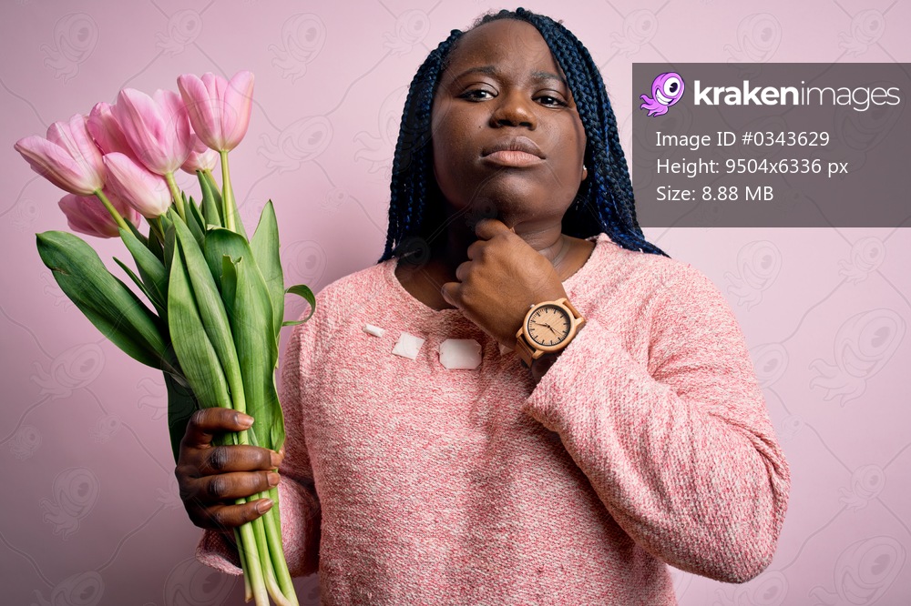 Young african american plus size woman with braids holding bouquet of pink tulips flower Touching painful neck, sore throat for flu, clod and infection - Kraken Images
