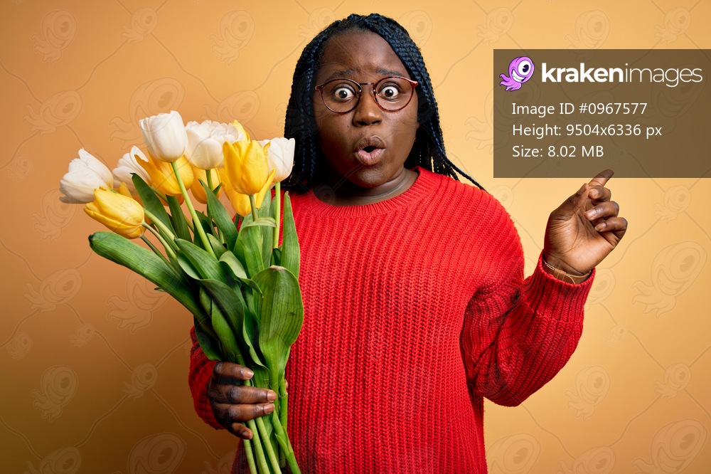 Young african american plus size woman with braids holding bouquet of yellow tulips flower Surprised pointing with finger to the side, open mouth amazed expression. - Kraken Images