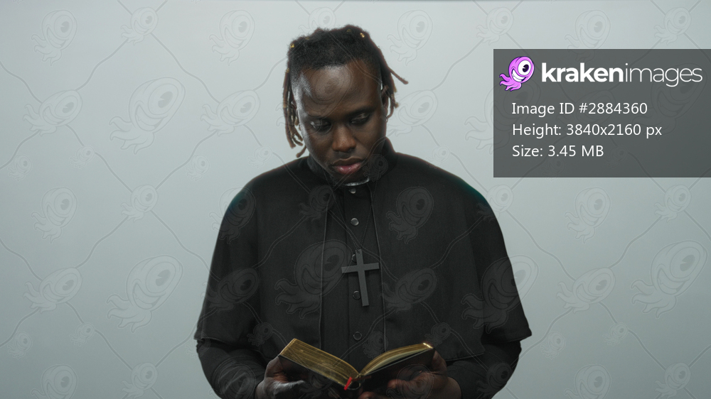 Young african american priest in black cassock reading a gilded book, holding it with hands in a pale gray studio; faith contemplation devotion.