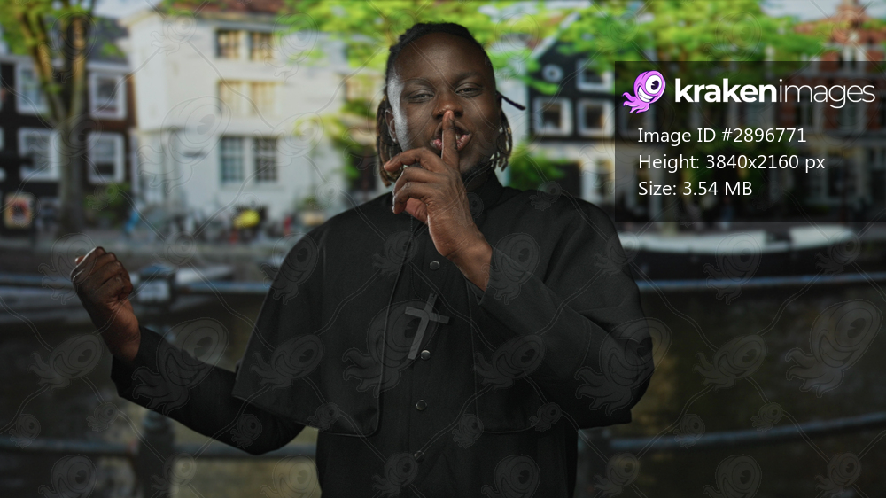 Young african american priest man smiling and pointing with cross necklace on street by canal; faith joy.