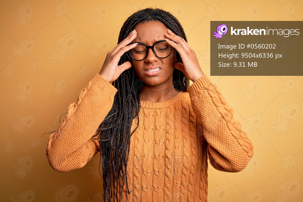Young african american smart woman wearing glasses and casual sweater over yellow background with hand on head for pain in head because stress. Suffering migraine. - Kraken Images
