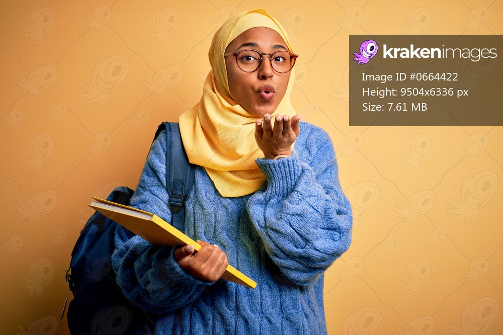 Young African American student woman wearing muslim hijab and backpack holding book looking at the camera blowing a kiss with hand on air being lovely and sexy. Love expression. - Kraken Images