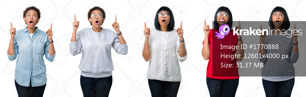 Young african american woman with afro hair over isolated background amazed and surprised looking up and pointing with fingers and raised arms.