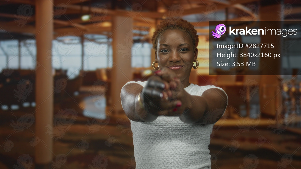 Young african american woman aims bare hand in pistol gesture inside modern building lobby; playful confidence.