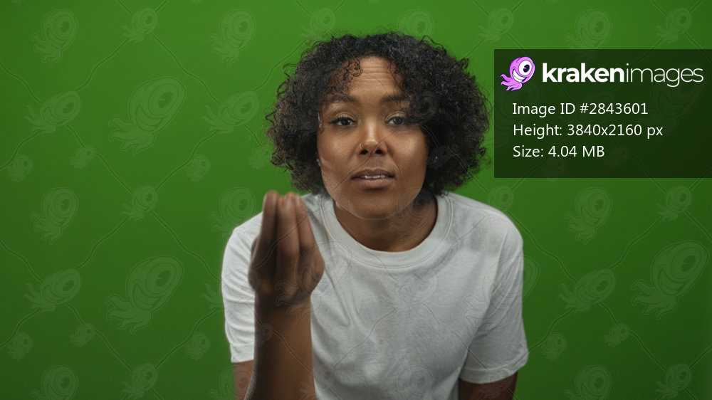 Young african american woman beckons with fingers in green studio setting; curiosity invitation intrigue.