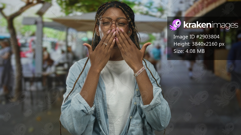 Young african american woman blowing kiss with hands to mouth on a city street terrace, wearing glasses and denim shirt; joy spontaneity.