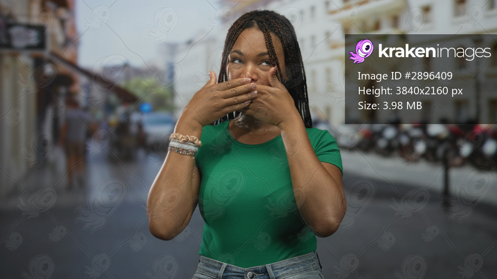 Young african american woman with braided hair covering mouth with both hands on urban street near building; surprise secrecy.