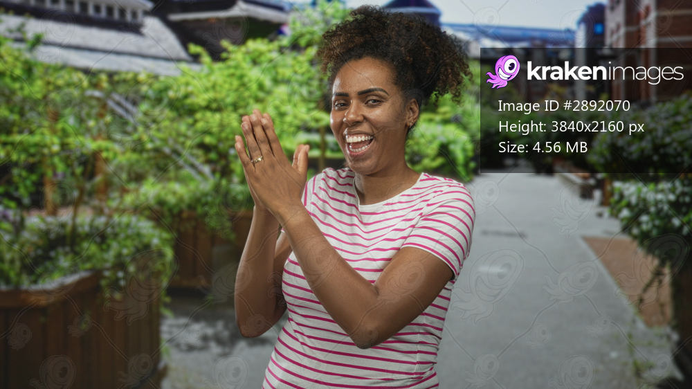 Young african american woman claps hands and laughs on a tree lined urban street with brick planters and buildings; celebration.