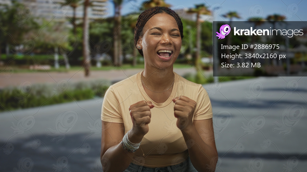 Young african american woman with clenched fists on a city street smiling and shouting, wearing beige tee and beaded bracelets; joy victory confidence. - Kraken Images